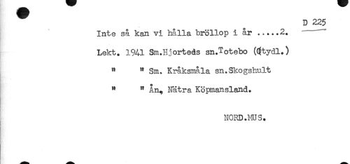//// D 225 //// Inte så kan vi hålla bröllop i år .....2. //// Lekt. 1941 Sm.Hjorteås sn.Totebo (0}tydl.) //// " " Sm. Kråksmåla sn.Skogshnlt //// ^ " Ån, Nät ra Köpmansland. //// NORD.HUS. ////