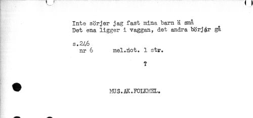 //// Inte sörjer jag fast mina barn ä små //// Det ena ligger i vaggan, det andra börjar ga //// s.246 //// nr 6 mel.iiot. 1 sty. //// * //// ? //// ^ HUS.AK.FOLKMEL. //// ! //// ( ////