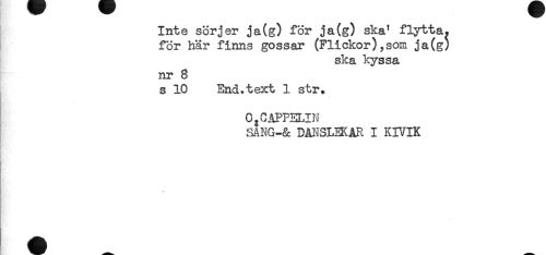 //// Inte sörjer ja(g) för ja(g) ska' flytta, //// för här finns gossar (Flickor),som ja(g) //// ska kyssa //// nr 8 //// s 10 End.text 1 str. //// O^CAPFELIN //// SANG-& DMSLEKAR I KIVIK ////