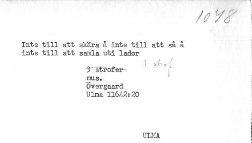 //// i //// Inte till att skära å inte till att så å //// inte till att samla uti lador //// ^strofer //// HUS. //// Svergaard //// Ulma 11642:20 //// ) //// ULMA ! //// H ////