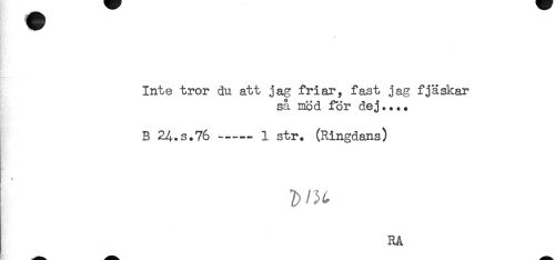 //// Inte tror du att jag friar, fast jag fjäskar //// så mod för dej.... //// B 24.S.76-----1 str. (Ringdans) //// * //// RÅ ////