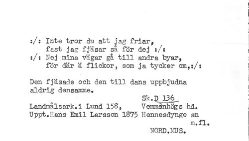 //// :/: Inte tror du att jag friar, //// fast jag fjäsar så för dej :/: //// :/: Nej mina vägar gå till andra byar, //// för där ä flickor, som ja tycker om,:/: ] //// * ^ //// Den fjäsade och den till dans uppbjudna //// aldrig densaxmie. ! //// Sk.D 136^ ! //// Landmålsark.i Lund 158, Vemmånhögs hd. //// Uppt.Hans Emil Larsson 1875 Hennesdynge sn //// m.fl. //// NORD.MUS. ////