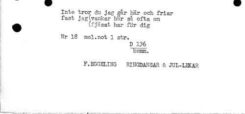 //// Inte tror du jag gar här och friar //// fast jag (vankar här så ofta om //// ^ (fjäsat har för dig //// Nr 1$ mel.not 1 str. //// D 136 //// ^ F.EGGELING RINGDANSAR & JUL-LEKAR. //// ! //// t - //// t //// *******"*"*** -< . .. --. . ______.. —T*-*-*".—, ^_ .. . -___ - .. ^ ____-------—. .. —^^r- _____ —____ ////