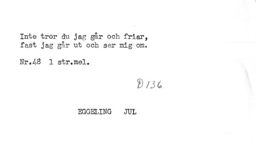 //// Inte tror du jag gar och friar, //// fast jag går ut och ser mig om. //// Nr.48 1 str.mel. //// P/36 //// EGGELING JUL //// t ////