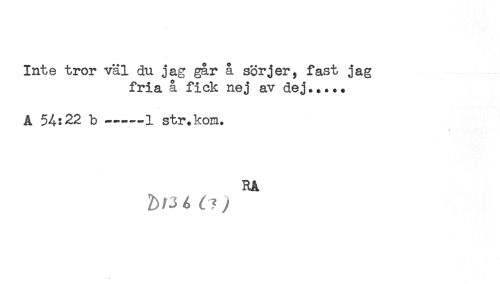 //// Inte tror väl du jag går å sörjer, fast jag //// fria å fick nej av dej..... //// A 54:22 b ——1 str.kom. //// RA //// 4 C ? ; ////