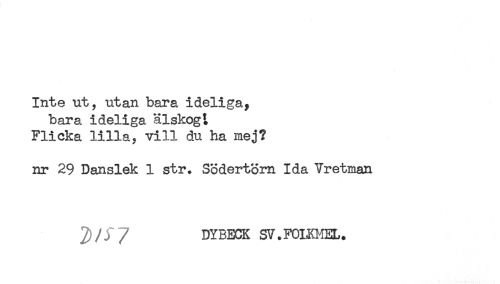//// Inte ut, utan bara ideliga, //// bara ideliga älskog t //// Flicka lilla, vill du ha mej? //// nr 29 Danslek 1 str. Södertorn Ida Vretman //// 7 DYBECK SV.FOLKMEL. ////
