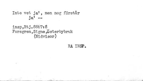 //// Inte vet ja* , men nog förstår //// ja* - //// insp?Rtj.8867:8 //// ___ + <*.+. //// Forsgren,Signe,Österby-bruk //// (Nidvisor) //// RÅ INSP. ////