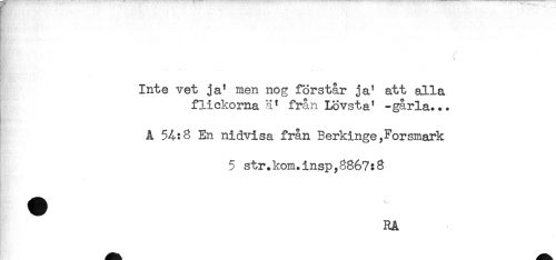 //// / //// BL,- ) //// s //// Inte vet ja' men nog förstår ja' att alla //// flickorna a' från Lövsta' -gårla... //// L //// A 54:8 En nidvisa från Berkinge,Forsmark //// 5 str.kom.insp,8867:8 //// RA ////