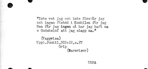//// "Inte vet jag och inte förstår jag //// och ingen fästmö i Kumkilen får jag //// Men får jag ingen så har jag haft na //// o Gudskelof att jag slapp na." //// (Vaggvisa) //// U ppl.Jumkil,303:22,s.27 //// Grip //// (TBarnvi sor) //// - //// ULMA ////
