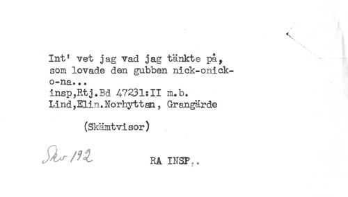 //// ' * . //// Int^ vet jag vad jag tänkte på, //// som lovade den gubben nick-onick- //// o-na... //// insp,Rtj.Bd 47231:11 m.b. //// Lind,Elin.Norhyttan, Grangärde //// (Skämtvisor) //// RA INSF,, ////
