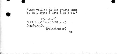 //// "Inte vill ja ha den svätte smen //// fö du ä svatt å loti å du ä le." //// (Danstext) //// Sirål.Fågelf or s ,10681, s.45 //// Granberg,G. //// (Polsktexter) //// ULMA //// [ „ - ////