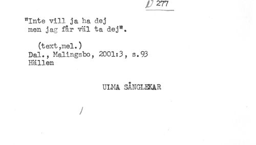 //// "Inte vill ja ha dej //// men jag får väl ta dej". //// (text,mel.) //// Dal., Halingsbo, 2001:3, s.93 //// Hällen //// UIMÅ SÅNGLEKAR //// 7 ////