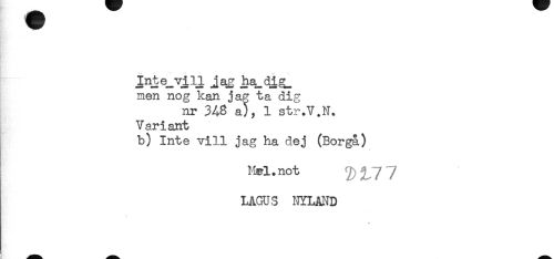 //// Hr ^ //// i //// Inte_vill jag ha_dig_ //// men nog kan jag ta dig //// nr 3A8 a)^ 1 str.V.N. //// Variant //// b) Inte vill jag ha dej (Borgå) //// Hpl. not 2) t7 7 //// LAGU-S HYLAI^D ////
