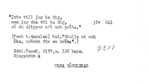 //// "Inte vill jag ha dig, //// men jag ska väl ta dig, jfr 241 //// så du slipper stå och gråta." //// (Text t.danslek) Mel."Skulle ut och //// åka, spände för en kråka".) //// 59F 77 //// Sdml.Vansö, 2l97,s. 120 kaps. //// Ringström A //// ULMA SÅNGLEKAR ////