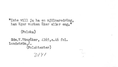 //// "Inte vill ja ha en njolnaredräng, //// han äger varken åker elTar eng." //// (Polska) //// Sdm.V. Vingåker, Ål65,s.46 fol. //// Lundström^J. //// (Polsktexter) //// 2/^ ////
