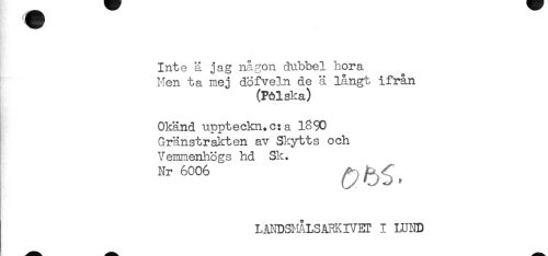 //// Inte ä jag någon dubbel hora //// Men ta mej dofveln de ä långt ifrån //// (Pölska) //// Okänd uppteckn.c:a 1890 //// Gränstrakten av Skytts och //// Vemmenhögs hd Sk. //// Nr 6006 ^ ^ ^ //// LANDSMALSARKIVEr I LUND ////