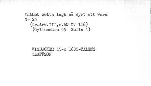 //// Inthet wetth iagh så dyrt att wara //// Nr 25 //// (Tr.Arw.III,s.60 DV 116) //// (Gyllemaärs 55 Sofia l) //// VISB3CKER 15-0 1600-TÅLEI-IS //// CLUFFSON //// i //// ' ////