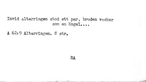 //// Invid altarringen stod ett par, bruden vacker //// som en ängel.... //// A 62:9 Altarringen. 8 str. //// RA ////