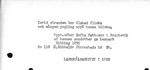 //// t' //// t //// Invid stranden bor älskad flicka //// och mången yngling uppå henne blicka; //// Uppt.efter Sofia Mattsson i Brantevik //// af hennes sondotter gm Lennart //// Ribbing 1895 //// No 110 O.NHbbelov Järrestads hd Sk. //// ^ LANDSMåLSARKIVEr I LUND ////