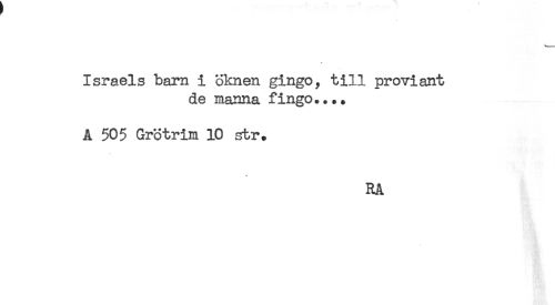 //// Israels barn i öknen gingo, till proviant //// de manna fingo.... //// A 505 Grötrim 10 ^r. //// RA ////