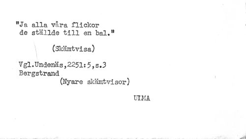 //// "Ja alla våra flickor //// de ställde till en bal." //// ^ (Skämtvi sa) //// : //// ! //// 1 //// i //// Vgl.Undenäs,2251:5,s.3 //// Bergstrand //// (Nyare skämtvisor) //// UH1Å //// .......____^^ ______^____.. .. - " ^ .. ........ ^ .....' ....... A. .. - ////
