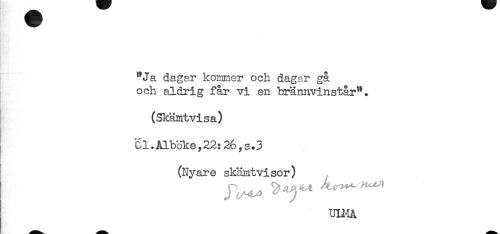 //// "Ja dagar kommer och dagar gå //// och aldrig får vi en brännvinstår". //// (Skämtvisa) //// Sl.Alböke,22:26,s.3 //// i (Nyare skämtvisor) ////