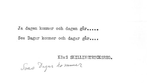 //// Ja dagen kommer och dagen går....* //// Se: Dagar koRimer och dagar går.... //// KB:S SKILLINGTRYCKSREG. ////