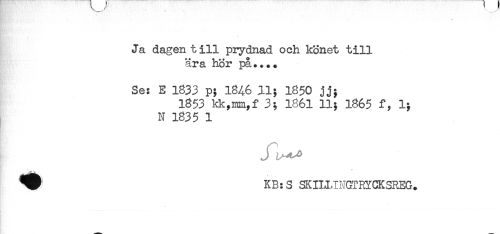 //// - //// Ja dagen t ill prydnad och könet till //// ära hör på.... //// Se: E 1833 p; 18^6 11; 1850 jj; //// 1853 kk,mm,f 3; 1861 11; 1865 f, 1; //// N 1835 1 //// J L^o //// * //// ^ KB:S SKILLINGTRYCKSREG. ////