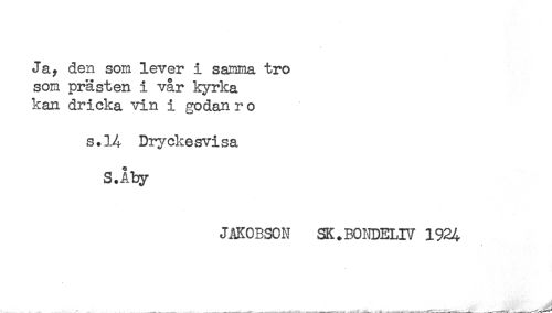 //// Ja, den som lever i samma tro //// som prästen i vår kyrka //// kan dricka vin i godan r o //// s.14 Dryekesvi sa //// S.Åty //// JAKOBSON SK.BONDELIV 1924 ////