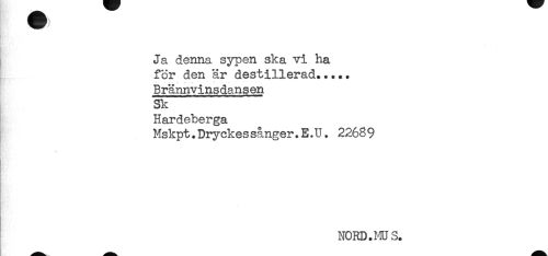 //// Ja denna sypen ska vi ha //// för den är destillerad..... //// Brännvinsdansen //// Sk //// Hardeberga //// Mskpt.Dryckessånger.E.U. 22689 //// NORD. MUS. ////