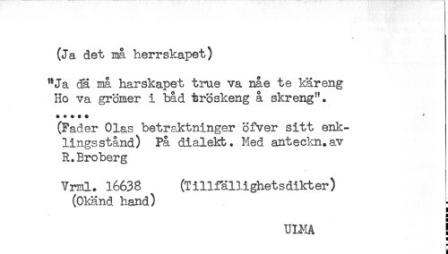 //// (Ja det må herrskapet) //// "Ja dä må harskapet true va nåe te käreng //// Ho va grömer i båd tröskeng å skreng". //// # # # # # //// (Fader Olas betraktninger Sfver sitt enk- //// lingsstånd) På dialekt. Med anteckn.av //// R.Broberg //// Vrml. 16638 (Tillfällighetsdikter) //// (Okänd hand) //// ! //// ULMA ! //// H //// = //// ) //// < ////