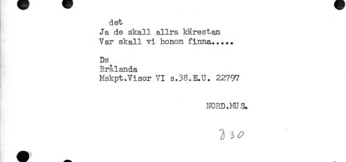 //// det //// Ja de skall allra kärestan //// Var skall vi honom finna..... //// Ds //// Brålanda //// Mskpt.Visor VI S.38.E.U. 22797 //// NORD. MUS. ////