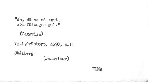 //// i //// "Ja, dä va så sant, //// som fölungen gol." i //// (Vaggvisa) //// . Vgtl,Grästorp, 4690, s.ll //// Stålberg //// (Barnvisor) //// ULMA ////