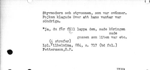 //// ! //// B //// Styvmodern och styvsonen, som var ovänner. //// Pojken klagade över att hans vantar var //// söndriga* //// "ja, du får fäll lappa dem, sade käringen //// ^r s ade //// gossen som liten var etc. //// (4 strofer) //// LplJiihelmina, 884, s. 717 (bd fol.) //// ^^ Pettersson,O.P+ //// ^ ^ HT.MR ////