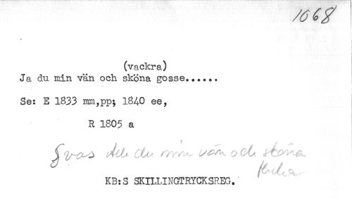 //// t //// (vackra) //// Ja du min vän och sköna gosse...... //// Se: E 1833 Him,pp; 18A0 ee, //// R 1805 a //// t //// ^ / //// KB:S SKILLINGTRYCKSREG. ////