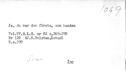 //// Ja, du var den förste, som handen //// 7:6.VF.S.L.S. nr 82 s.269-270 //// Nr 128 SJ.M.Holsten,Cstanå //// N.s.397 //// i //// < //// [ //// ABO ! //// g //// ! //// < ////