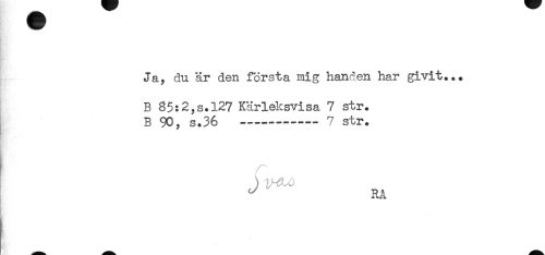//// Ja, du är den första mig handen har givit... //// B 85:2,s.127 Kärleksvisa 7 str. //// B 90, s.36 ----— 7 str. //// ^ RÅ ////