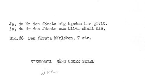 //// ! //// ! //// : //// Ja, du är den första mig handen har givit, //// ja, du är den första som bliva skall min, //// Sid.86 Den första kärleken, 7 str. //// ST ERHÅLL SÅNG UNDER SEGEL ////