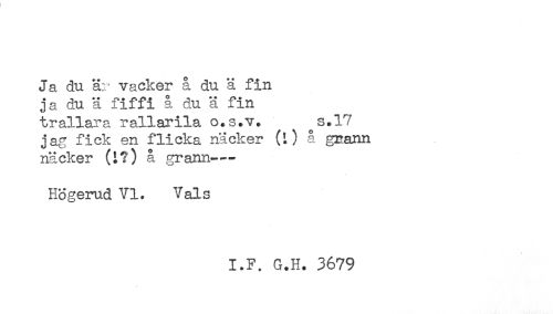 //// Ja du är vacker å du ä fin //// ja du ä fiffi å du ä fin //// trallara rallarila o.s.v. s.17 //// jag fick en flicka nä eker (i) å grann //// nä eker (t?) å grann-— //// Hogerud VI. Vals //// I.F. G.H. 3679 ////