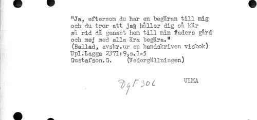//// "Ja, eftersom du har en begäran till mig //// och du tror att ja^ håller dig så kär //// så rid då genast hem till min faders gård //// och mej med alla ära begära." //// (Ballad, avskr.ur en handskriven visbok) //// Upl.Lagga 2371:9,s.l-5 //// Gustafson.G. (Vedergällningen) ////