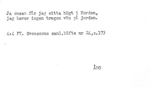 //// Ja ensam får jag sitta högt i Norden, //// jag haver ingen trogen vän på jorden. //// PY. Svenssons saml.häfte nr 24,s.173 //// * //// ÅBO ////