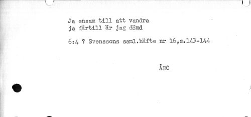 //// Ja ensam till att vandra //// ja därtill är jag dömd //// 6:4 ? Svenssons saml.häfte nr l6,s.l43-L44 //// ÅBO ////