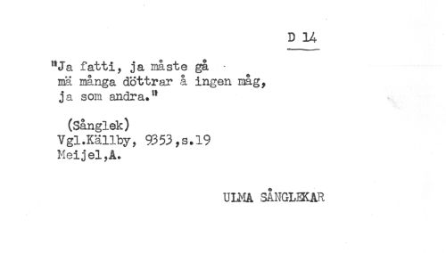 //// D 14 //// "Ja fatti, ja måste gå //// mä många döttrar å ingen mag, //// ja som andra." //// (Sånglek) //// Vgl.Källby, 9353,s.19 //// Meijel,A. ////