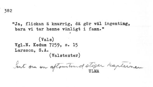 //// "Ja, flickan ä knurrig, dä gör väl ingenting, //// bara vi tar henne vänligt i famn." //// + //// (Vals) //// Vgl.N. Kedum 7259, s. 15 //// Larsson, S.A. //// (Valstexter) ////