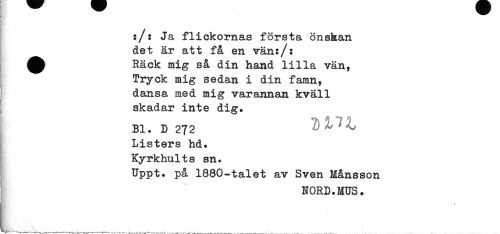 //// :/: Ja flickornas första önskan //// det är att få en vän:/: //// ^ Räck mig så din hand lilla vän, //// Tryck mig sedan i din famn, //// dansa med mig varannan kväll //// skadar inte dig. //// Bl. D 272 //// Listers hd. //// * //// Kyrkhults sn. //// Uppt. på 1880-talet av Sven Månsson ////