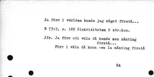 //// Ja förr i världen kunde jag något förstå... //// B 73:2, s. 189 Elekrisiteten 8 str.kom. //// Jfr. Ja förr uti väla då kunde man nånting //// förstå... //// Förr i väla då kunn -en la nånting förstå ////
