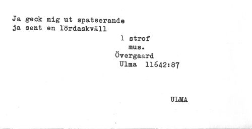 //// Ja geck mig ut spatserande //// ja sent en lördaskväll //// 1 strof //// mus. //// Overgaard //// Ulma 11642:87 //// ULMA ////