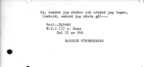 //// Ja, handen jag räcker och afsked jag tager, //// (ombord, ombord jag måste gå)--- //// Repl.,Björkö //// W.9.2 (l) n. Hass //// Del II nr 956 //// RANCKEN FÖRTECKNING ////