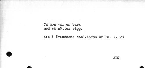 //// Ja hon var en bark //// med så nötter rigg. //// 4:4 ? Svenssons saml.häfte nr 28, s. 28 //// ^ ÅBO ////