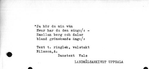 //// "Ja hör du min vän //// Hvar har du den säng:/: - //// Emellan berg och dalar //// bland grönskande äng:/: //// Text t. ringlek, valstakt //// ^ Nilsson,A. //// Dans t ex t Vals //// LANDMÅLSARKIVET UPPSALA ////